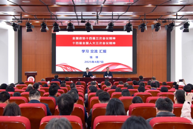 錢鋒結合參會經歷和學習體會,圍繞“兩會”的基本情況、兩個工作報告主要內容、“兩會”熱點話題等作了深入淺出的解讀,系統梳理了“兩會”的核心議程與政策導向,既立足兩會精神,又緊扣國家發展需求。報告通過解讀“兩會”政策藍圖,洞察國家發展脈搏,闡釋了政府工作報告中十大新詞背后的民生紅利與產業新機。他還結合政府工作報告中的科技熱詞,強調了高水平科技自立自強的最新部署,指出要開展好有組織的科研和協同創新,加強科技成果的轉化,深化教育科技人才一體改革。錢鋒指出,習近平總書記在看望參加政協會議的民盟民進教育界委員時的重要講話,就如何堅持正確辦學方向、深化教育綜合改革、強化教育對科技人才的支撐性作用等方面提出了明確要求,充分顯示出黨對教育工作的高度重視。作為高校,我們要把總書記關于教育、科技、人才的重要指示細化為路線圖和施工圖,推進教育高質量體系建設,同時要聚力科技創新和產業創新,發揮自身優勢,打造產教融合、科教融匯的人才培養體系,為提升國家創新體系整體效能貢獻智慧和力量。