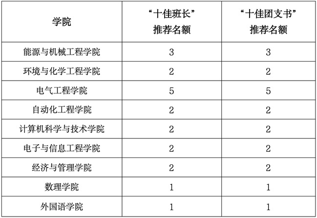 各學院可結合實際情況,推薦符合要求的“十佳班長”“十佳團支書”候選人。填寫《上海電力大學“十佳班長”“十佳團支書”申報表》(附件1)和《上海電力大學“十佳班長”“十佳團支書”信息匯總表》(附件3),推薦至校團委。各學院名額分配如下: