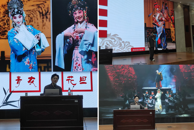 講座中,傅希如老師以充滿趣味性的互動問答形式,引發現場師生對京劇藝術的深度思考。傅老師從徽班進京的歷史淵源講起,對生旦凈丑四大行當進行特征分析,這既對京劇起源與發展的系統梳理,又深入淺出地解讀了京劇“虛擬化” “舞蹈化”“夸張化”“程式化”的表演藝術特征。期間,傅希如老師頻頻開嗓,其字正腔圓的聲音一出便驚艷四座,讓在座的師生們大飽耳福。無論是聲情并茂的吟誦《破陣子》、新編歷史京劇《武帝劉徹》,還是中氣十足的演唱《智取威虎山》,傅老師信手拈來,帶領師生零距離領略京劇唱段的音韻之美。在傅老師詳細的示范與教學中,臺下師生齊聲并唱,學得是有板有眼。一曲盡了,師生們沉浸式體會到京劇演員“臺下十年功”的不易以及深藏在這種不易之后的演員們對京劇藝術的熱愛。