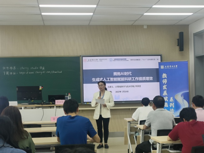 5月20日,由黨委教師工作部、人事處主辦,計(jì)算機(jī)學(xué)院承辦的教師發(fā)展賦能+系列培訓(xùn)之“AI賦能--生成式人工智能賦能科研工作提質(zhì)增效”在臨港校區(qū)一教311智慧教室開(kāi)講。本次課程由計(jì)算機(jī)學(xué)院李澤萱博士主講,計(jì)算機(jī)學(xué)院院長(zhǎng)溫蜜主持。