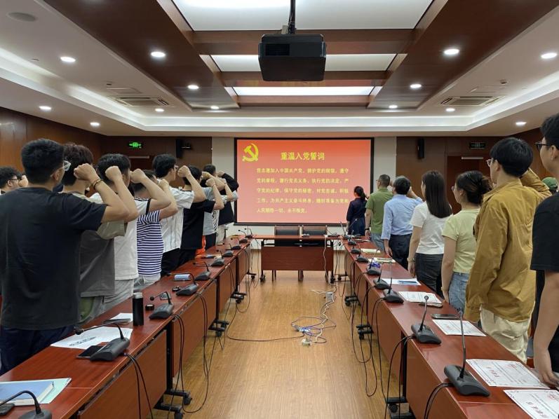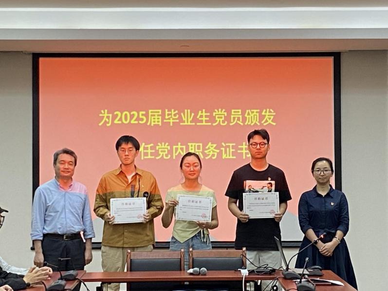 周婷與陳乃超共同為曾經擔任過黨內職務的畢業生黨員代表頒發證書,肯定他們在支部工作中付出的努力與取得的成績。隨后,周婷作為領誓人,帶領全體黨員同志重溫入黨誓詞。面對鮮紅的黨旗,黨員們高舉右拳,鏗鏘有力的誓言在會場回蕩,彰顯出黨員同志們對黨的忠誠與為共產主義事業奮斗終身的決心。