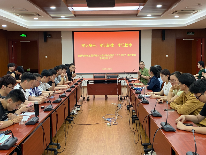 能源與機械工程學院于5月22日在學術樓301會議室召開“牢記身份、牢記紀律、牢記使命”——2025屆畢業生黨員“三個牢記”離校教育系列活動。學院黨委副書記周婷,副院長、黨委委員陳乃超出席,學院專職組織員王喆主持,全體畢業生黨員參會,共同接受思想洗禮。