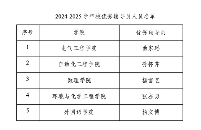 根據《關于評選上海電力大學2024-2025學年優秀輔導員的通知》的精神和要求,經個人積極申報、二級學院推薦,由學工部會同相關部門對推薦人員進行工作實績考察并組織答辯評審。根據評審結果,共推薦5名候選人報校表彰獎勵工作委員會審核,確定2024-2025學年上海電力大學優秀輔導員人員名單,現公示如下(按姓氏筆畫排序):