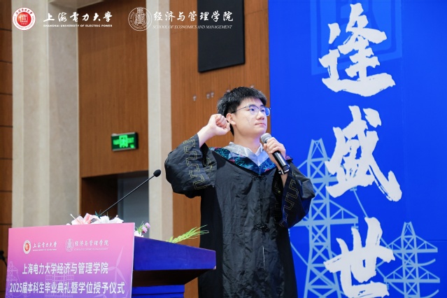 “銘記校訓,愛國勤學,務實奮進,堅定理想信念,腳踏實地,砥礪前行,傳承時代精神,不畏艱險,勇擔使命,把個人理想追求融入黨和國家事業之中,以青春之我、奮斗之我,為民族復興鋪路架橋,為祖國建設添磚加瓦。”錚錚誓言、字字鏗鏘!滿懷激情的畢業獻詞吶喊出上電經管學子的心聲與壯志。