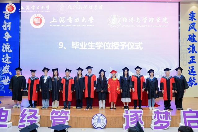 畢業典禮上,張藝宣讀經濟與管理學院2025屆上海電力大學優秀畢業生的表彰決定。潘華宣讀經濟與管理學院2025屆上海市普通高等學校優秀畢業生的表彰決定。侯建朝宣讀經濟與管理學院2025屆校友聯絡員聘任的決定。學院領導及教授代表分別為受表彰代表頒獎,為校友聯絡員代表頒發聘書。