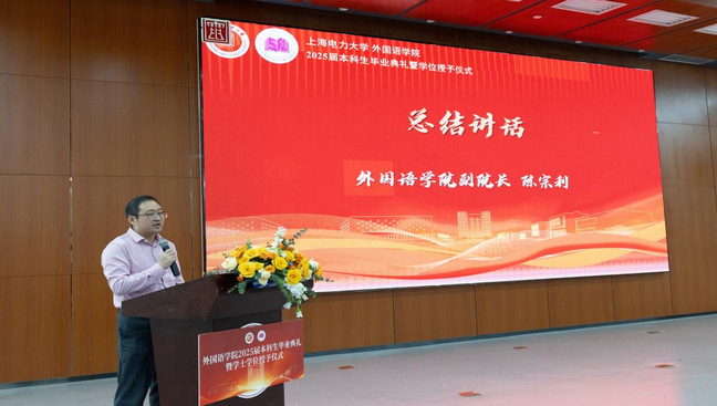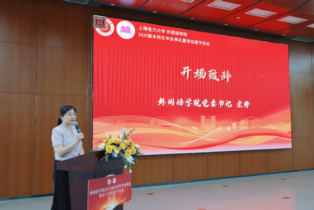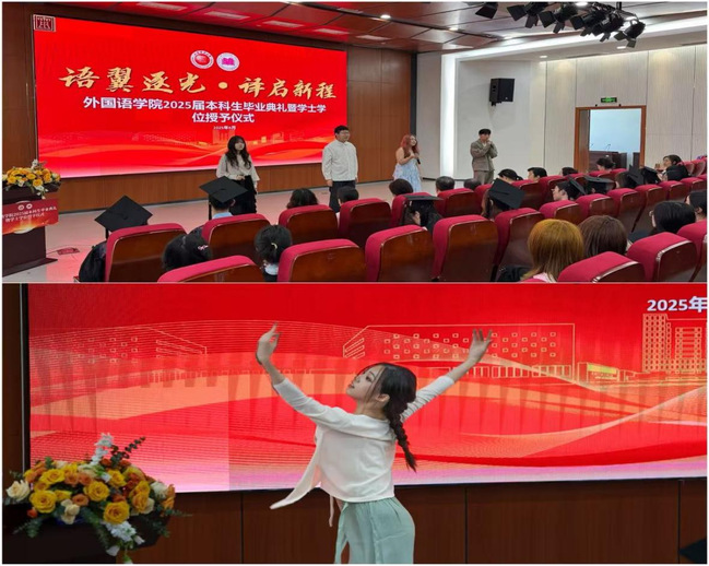 6月6日,外國語學院2025屆本科生畢業典禮暨學位授予儀式在學術樓103報告廳隆重舉行。學院黨委書記余靜、副院長陳宗利、黨委副書記余嘉、副院長馮為蘭,以及各系部主任、專業負責人、教師代表、畢業生家長代表共同見證這一莊嚴時刻。