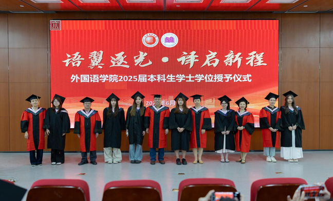 最后,陳宗利宣讀學士學位授予決定,與會教師代表共同為畢業生撥穗正冠、合影留念,為大學四年時光劃上圓滿的句號。典禮在溫情與豪情中落幕。祝愿每一位外院學子前途似錦,一路生花;揚帆遠航,續寫華章。
