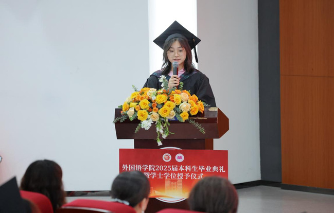畢業生代表、英語專業吳佳回顧求學時光,感恩學校及學院提供的平臺與資源,感謝師長的悉心培育。