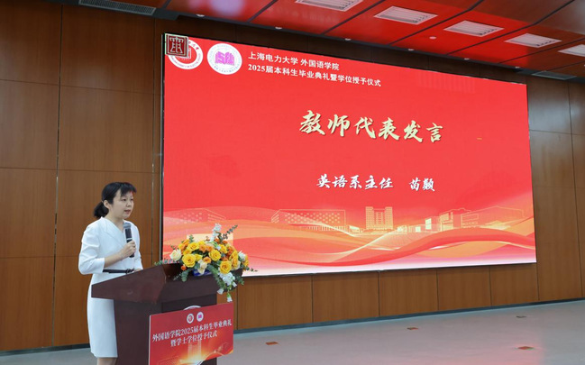 教師代表、英語系主任苗穎寄語學子不忘初心,終身學習;以開闊胸襟擁抱變化,用專業能力書寫未來。