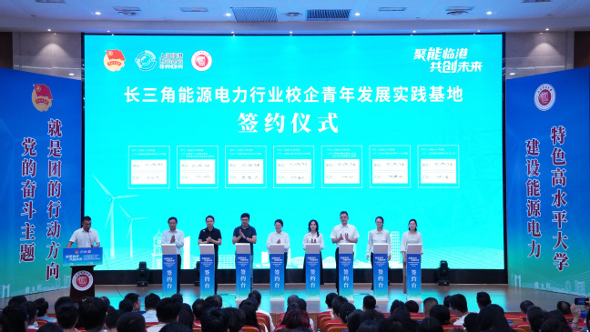 在簽約儀式環節,我校團委與國家電網有限公司華東分部團委、國網上海市電力公司團委、國網浙江省電力公司團委、國網安徽省電力有限公司團委、中國華能集團有限公司華東分公司團委、中國華電集團有限公司上海分公司團委、華電江蘇能源有限公司團委、申能(集團)有限公司團委、安徽省能源集團有限公司團委、中國電力工程顧問集團華東電力設計院有限公司團委、上海電力股份有限公司團委、上海電力設計院有限公司團委、中國能源建設集團江蘇省電力設計院有限公司團委、上海電力建設有限責任公司團委、上海治臻新能源股份有限公司等15家長三角能源電力行業企業團組織和企業簽署青年發展實踐基地。