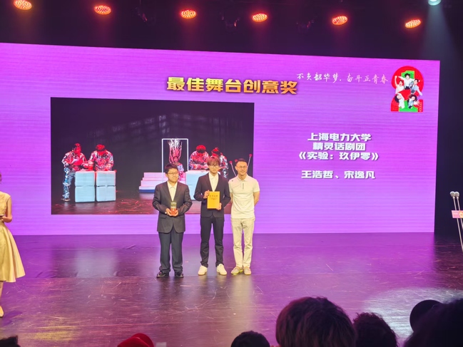 本屆大學生話劇節共有116部作品參賽。經過評委們嚴謹認真的評選,入圍線下決賽展演的劇目作品24部。我校大學生話劇團(精靈話劇團)時隔五年攜精心打磨的長劇劇目《實驗:玖伊零》再次回歸上海市大學生話劇節,進入決賽展演。該劇憑借獨特且富有創意的舞美設計、燈光設計和服裝設計以及所有演員們出色的表演和團隊辛勤的付出,最終斬獲最佳舞臺創意獎與優秀演出團隊獎兩項大獎。