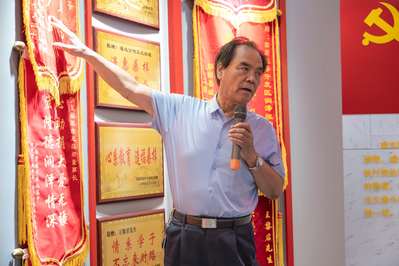 活動當日,實踐隊首先參觀了德善展館。展館內,泛黃的助學賬本、受助學生的感謝信、扶貧項目的照片墻,無聲訴說著王黎君三十年如一日的善行。隊員們駐足于“千人助學計劃”展板前,聆聽王老如何從一名退伍軍人成長為慈善企業家,又如何將企業利潤的30%定向用于教育扶貧。隨后,成員們觀看了王黎君事跡紀錄片。影片中,王老頂著烈日為山區學校送課桌椅、冒雨走訪殘疾家庭、自掏腰包修建鄉村道路的畫面,讓在場師生熱淚盈眶。
