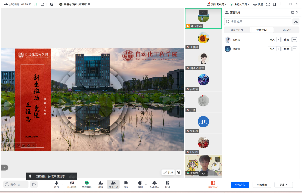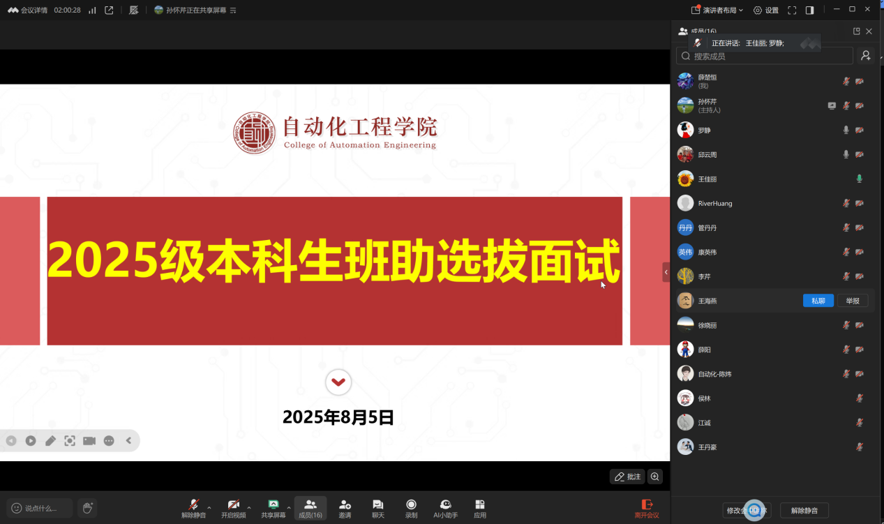 為幫助2025級本科新生快速適應(yīng)大學(xué)生活,充分發(fā)揮高年級學(xué)生“傳幫帶”作用,8月5日,自動化工程學(xué)院以線上形式組織開展本科新生班助選拔面試工作。學(xué)院黨委副書記王佳麗出席會議,2025級全體新生班主任、輔導(dǎo)員參與評審,對候選人進行綜合考察。