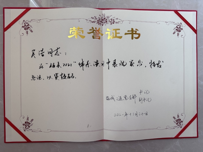 秉持著“逢敵敢亮劍”的精神,我刻苦訓練,沖鋒在前,不斷鞭策自己,努力提高軍事技能。體能考核常年全連第一,并在2021年3月的全營群眾性練兵比武中取得了“全營體能第三”的佳績。在2021年底被評選為義務兵骨干,2022年通過了集團軍“預提指揮士官”考核,被評為“區隊先進個人”。這些成績的背后,無不體現著我對軍營的無限熱愛和對軍人身份的無比自豪。