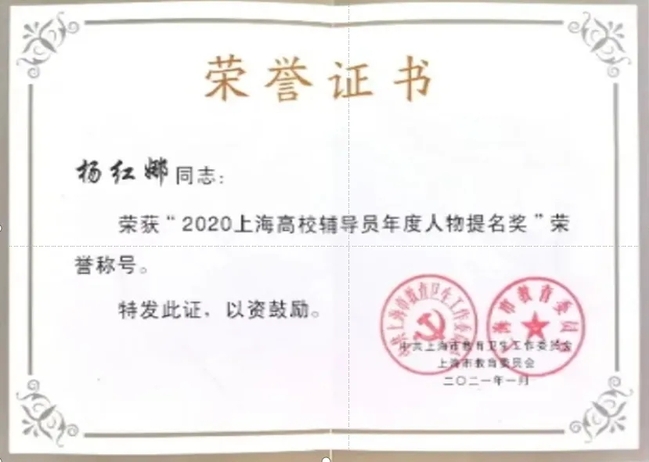 楊紅娜老師始終將每個(gè)學(xué)生放在心里,悉心指導(dǎo),用心引導(dǎo)。作為思政輔導(dǎo)員,楊紅娜老師受到各方的肯定,先后獲得上海市育才獎(jiǎng)、校優(yōu)秀教育工作者、“我心目中的好老師”提名獎(jiǎng)等榮譽(yù)。