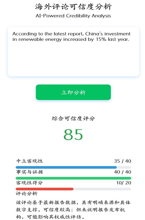 團隊技術攻堅組基于DeepSeek API成功開發了“能源報道偏見檢測小程序”,實現了“情感分析-可信度評估-智能評論生成”全流程自動化處理;構建的語料庫收錄了13國能源報道原文,支持關鍵詞偏差實時比對。內測期間,系統成功識別32篇傾向性報道,為相關部門優化國際傳播策略提供了數據依據,更通過持續更新的多源數據,成為提升學院能源電力輿情分析平臺的重要組成部分。