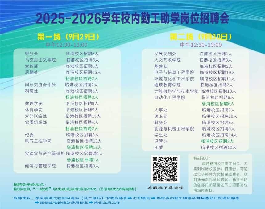 有意向參加勤工助學的學生請下載本通知附件:《上海電力大學勤工助學崗位應聘表》,自行打印填寫。應聘一個崗位提交1張表格。(此次招聘會僅面向本科生預科生)