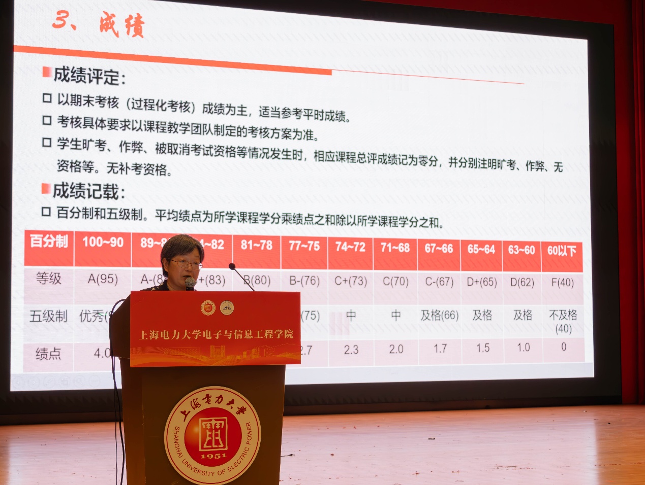隨后,薛亮介紹了學(xué)校、學(xué)院和專業(yè)情況。她首先回顧了上海電力大學(xué)作為“電力工程師的搖籃”七十余年的輝煌辦學(xué)歷史,以及學(xué)校在學(xué)科建設(shè)與能源電力領(lǐng)域的突出優(yōu)勢。她重點(diǎn)闡述了電信學(xué)院的發(fā)展沿革、師資力量與學(xué)科布局,展示了學(xué)院在科學(xué)研究、學(xué)生科創(chuàng)競賽以及高質(zhì)量就業(yè)方面取得的豐碩成果,特別是畢業(yè)生在集成電路、信息通信、能源電力等國家重點(diǎn)行業(yè)受到廣泛歡迎,鼓勵新生們充分利用學(xué)院提供的優(yōu)質(zhì)平臺,規(guī)劃好大學(xué)生涯,學(xué)有所成。
