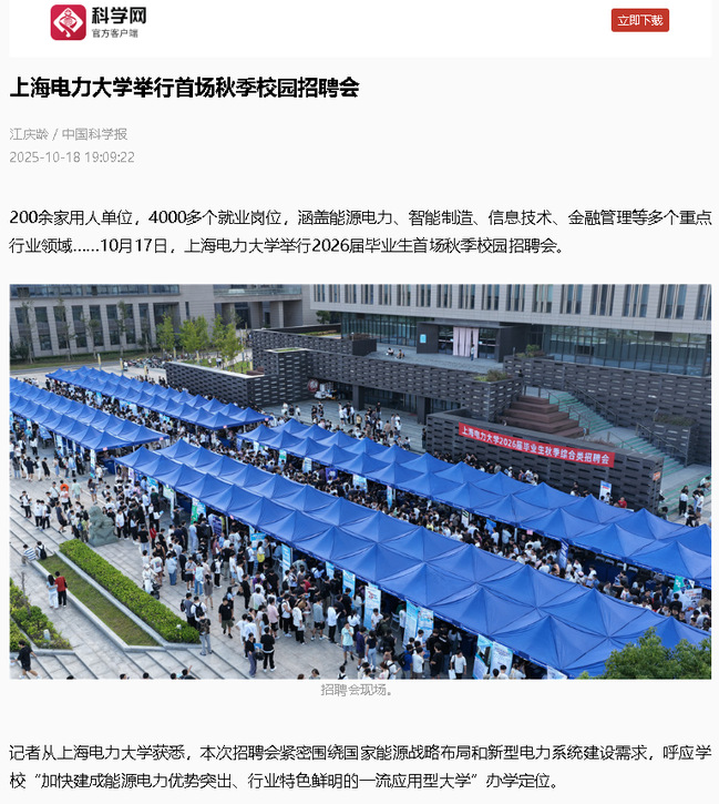 《上海科技報(bào)》210余家企業(yè)攜4000+崗位進(jìn)校攬才 上海電力大學(xué)2026屆首場(chǎng)秋季校園招聘會(huì)舉行