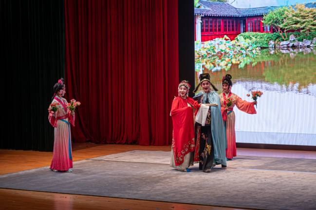 演出精選《牡丹亭》中《游園·驚夢》《尋夢》《回生》等核心選段,以細膩生動的表演,將杜麗娘與柳夢梅的愛情故事演繹得委婉動人。舞臺上,演員以水袖為筆、唱腔為弦,一顰一笑盡顯昆曲之雅,一唱一嘆皆訴人間至情。笛、簫、笙等傳統樂音與婉轉“水磨調”相映生輝,將昆曲“聲中無字,字中有聲”的韻律之美烘托得淋漓盡致,引得現場觀眾沉醉其中,掌聲不斷。