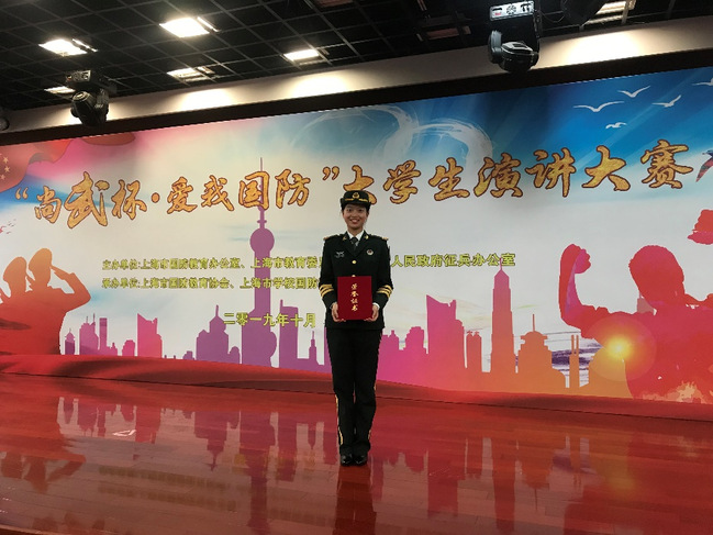 帶著這份熱愛她參加了上海市“尚武杯·愛我國防”大學生演講大賽。反復修改演講稿,不厭其煩地練習字詞的發音、語句的連貫、感情的輸出……在無數日夜的打磨中,她不斷進步、不斷完善,最后以自信從容的身姿,克服一切困難,站在了演講臺上,拿下了市級二等獎。