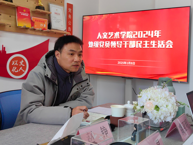 2025年1月8日上午,人文藝術學院在臨港校區數理樓B211會議室召開2024年處級黨員領導干部民主生活會。校黨委副書記仰頤蒞臨指導,校融媒體中心主任兼宣傳部副部長趙錚、校黨委宣傳部孟繁晨作為督導組列席指導。人文藝術學院處級黨員領導干部、黨總支委員、專職組織員出席會議。會議由人文藝術學院黨總支書記周潔明主持。