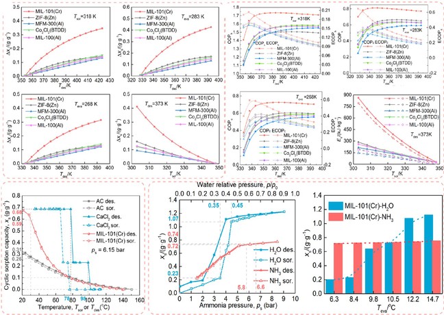 通過穩(wěn)定性和吸附性能的實驗和計算結(jié)果,綜合優(yōu)選五種MOFs-氨工質(zhì)對并結(jié)合吸附循環(huán)分別評價了熱泵、制冷、制冰、長/短周期儲熱等場景下的性能,揭示了熱能轉(zhuǎn)換與儲存性能與解吸溫度、蒸發(fā)溫度和吸附溫度的內(nèi)在關(guān)系。最終對比了MOF-氨工質(zhì)對與傳統(tǒng)吸附劑-氨工質(zhì)對以及MOF-水工質(zhì)對的供儲熱性能,發(fā)現(xiàn)MOF-氨工質(zhì)對在低溫環(huán)境的供熱場景下具有顯著性能優(yōu)勢,為極端氣候下的實際應用提供了新思路。