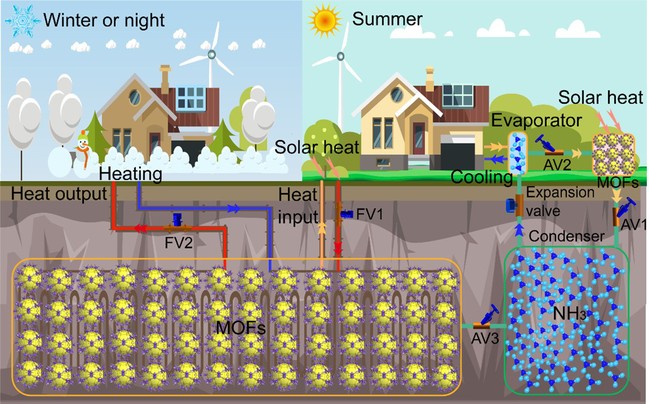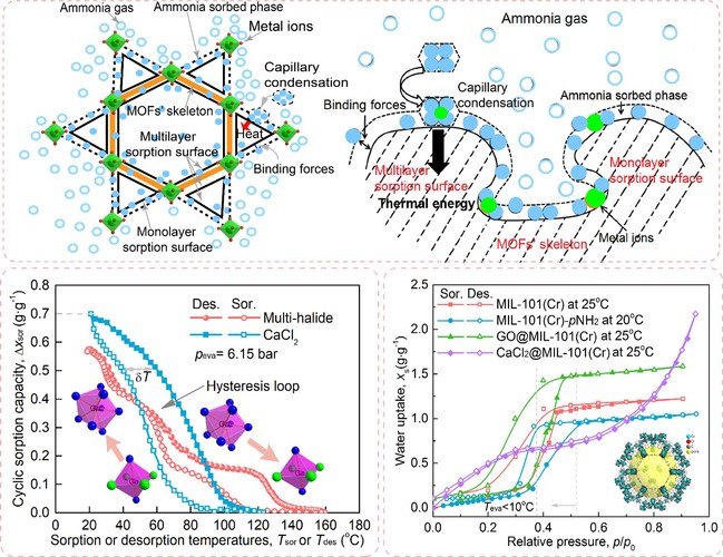 吸附式熱能轉(zhuǎn)換和儲存是高效利用太陽能和工業(yè)余熱等低品位熱能的關(guān)鍵技術(shù)之一,通過吸附劑與吸附質(zhì)的吸附和解吸過程可實現(xiàn)熱驅(qū)動的可持續(xù)供暖、制冷、太陽能收集和燃料儲存等應用。該領(lǐng)域研究涉及工程熱力學、傳熱學、配位化學、聚合物功能材料、機械工程等學科,具有顯著學科交叉特色。金屬有機框架(MOFs)吸附劑因其具有高比表面積和孔體積以及清晰結(jié)構(gòu),而氨工質(zhì)具有寬溫區(qū)和高焓值等特點。在“雙碳”和極端氣候頻發(fā)背景下,基于MOF-氨工質(zhì)對的固體吸附系統(tǒng)具有高儲能密度和溫度適應性、低熱損失等優(yōu)勢,如何構(gòu)筑高性能吸氨的MOF吸附劑和新型吸附循環(huán)是破解極端氣候下可持續(xù)熱能轉(zhuǎn)換與儲存應用難題的關(guān)鍵。