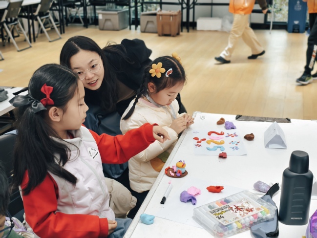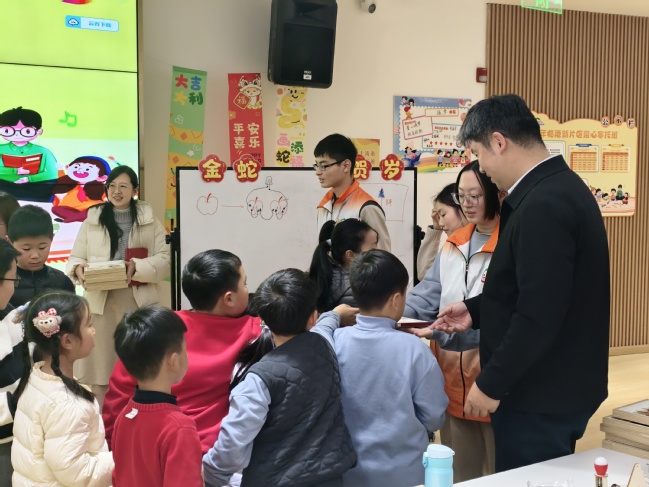 隨后,領導一行詳細了解了海立方寒托班運行情況,包括具體活動安排、師資配備、課程安排及后勤保障等工作細節。孫筱和與愛心寒托班志愿者親切交流,仔細詢問我校志愿者的工作內容和切身感受。我校志愿者負責人、外國語學院英語專業朱庭宇表示,“非常感謝臨港新片區團工委和學校團委提供的寶貴的學習機會。此次寒托班,不僅讓自己學會了如何將學校學習的理論知識和實踐相結合,也讓自己懂得了如何與小孩子相處。自己從一開始面對孩子玩鬧時的‘不知所措’到后來解決孩子們問題的‘從容淡定’的過程中,收獲了成長。”寒托班學生們為孫鎮長等送上了自己親手制作的非遺竹編畫和暖心的新春祝福。
