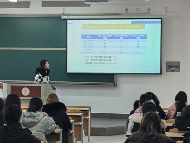 在2024級新生的主題班會中,輔導員重點進行學業成績分析和學業指導,以專業為單位解讀同學們上學期的平均績點、掛科情況,并根據掛科情況以及宿舍分布、掛科名錄等分析學業上所存在的問題,指出學業態度的重要性,并從成績分析出發與學生制定大一下學期計劃,如班級內部建立幫扶小組等。