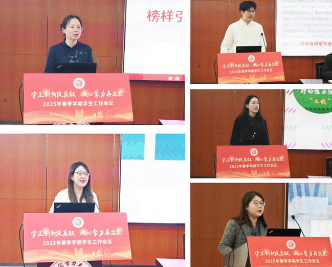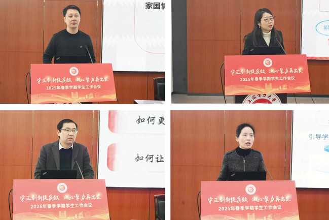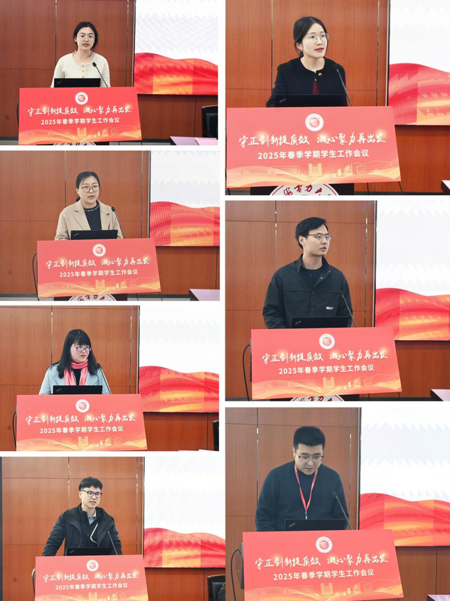 隨后,武裝部、團委、研究生工作部和學生工作部負責人分別圍繞扎實做好校園安全管理、加強思想政治引領、夯實創新人才培養、強化學風建設、促進高質量充分就業以及推動輔導員隊伍專業發展等方面,全面規劃并部署2025年重點任務,為推動學校事業高質量發展實現新躍升貢獻學工力量。