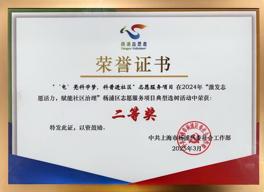 近日,在楊浦區2024年度“激發志愿活力,賦能社區治理”志愿服務項目典型選樹活動中,我校獲評“優秀組織獎”;我校電氣工程學院劉紫薇老師指導的“‘電’亮科學夢,科普進社區”志愿服務項目從83個參選項目中脫穎而出,榮獲優秀項目二等獎并入選2024年度楊浦區“激發志愿活力,賦能社區治理”志愿服務項目典型選樹案例集。