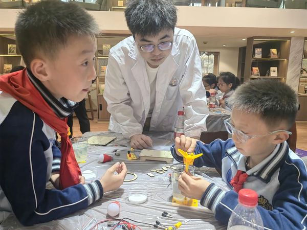 “小燈泡亮了!風(fēng)車也轉(zhuǎn)起來了!”上海師范大學(xué)附屬楊浦濱江實(shí)驗(yàn)小學(xué)四年級(jí)的吳義弘和上海電力大學(xué)的志愿者哥哥楊王淏很快“來電”了。兩人攜手做了結(jié)合化學(xué)電池和簡單電路的實(shí)驗(yàn),利用鹽水、鎂片和碳片組成原電池發(fā)電,驅(qū)動(dòng)小型風(fēng)車轉(zhuǎn)動(dòng),點(diǎn)亮燈泡。